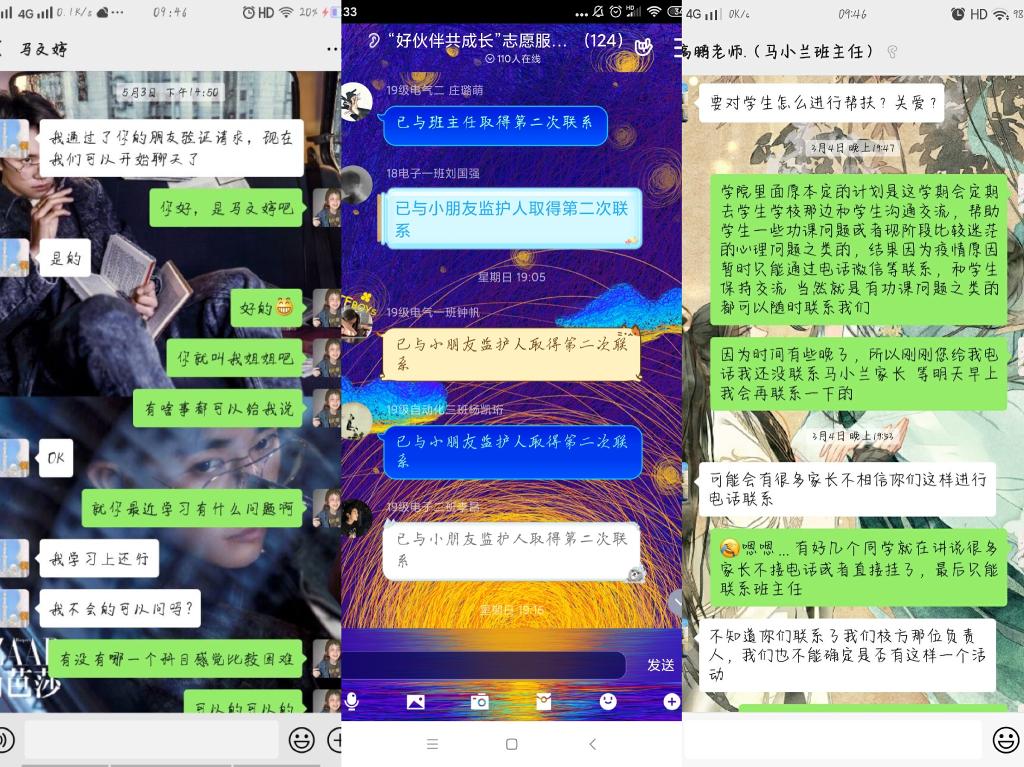 组织志愿者通过电话、QQ等方式与留守儿童先后联系两次。第一次联系过程中,志愿者们碰到了诸如对接孩童联系方式有误、家里人拒接电话、语言沟通不便等困难。志愿者们通过学生老师、当地村干部等想方设法联系到自己的志愿服务对象,向孩子们讲解介绍了防疫常识与注意事项,并增进了解便于后续工作。5月初,糖果派对