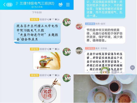 各班级于4月23日至27日陆续举行了线上主题班会,各班级通过不同的方式去增强同学们爱惜粮食的意识,有的班级在班会开始前齐声诵读《悯农》,让同学们从朗读中体会一粥一饭的来之不易,有的班级则合唱歌曲《知足》,倡导大家在生活中要用之有度,避免刻意浪费。各班在班会结束后组织大家进行讨论,大家认为,“光盘”不仅仅代表着节约粮食,节省一粒米、一度电、一支笔都是“光盘”,不仅要严格要求自身,更要去带动身边更多的人“光盘”。本次活动在大家每天“光盘”打卡的行动中取得圆满成功。