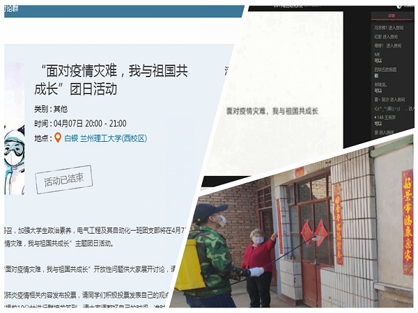各团支部采用视频展播、问题思考、事迹分享、互动讨论等多种形式。《英雄之城》、《生死金银潭》等一部部抗“疫”群英谱,让青年学生知道有勇敢拉响警报的人、有与死神争分夺秒的人、有各地星夜赶路驰援的人,平凡的人造就不凡的诗篇。在本次疫情防控工作中,各支部都涌现出防控志愿者的身影,由此活动中事迹分享环节,志愿者们结合自身实际分享居家学习期间的所思所想及参加现居住地疫情防控工作的个人事迹。互动讨论中,同学们表达了有对战疫期间中国特色社会主义制度凸显出优越性的深情讴歌,有对舍小家为大家驰援武汉医护人员的高度敬意,还有作为青年人立志艰苦奋斗与祖国共成长的坚定决心等。