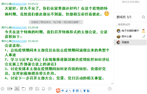 自2019年12月新冠疫情爆发以来,全国人民在以习近平同志为核心的党中央带领下,积极抗击疫情,目前已经取得了阶段性胜利。2020年3月15日,电子本科生第1党支部采取在支部qq群内互动交流的方式,召开网上支部委员会会议。