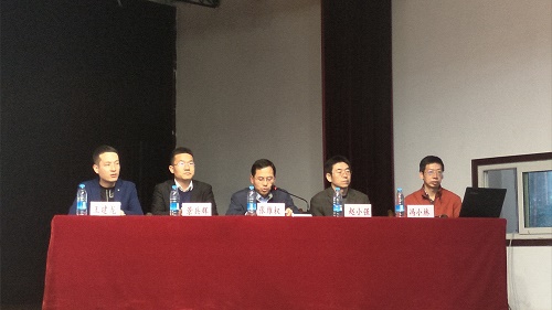党委张维权副书记、赵小强教授、冯小林副教授、西门子数字化工厂和过程驱动集团景兵辉工程师以及我校12届校友、西门子兰州分公司技术工程师王建龙。会议由张维权副书记主持。