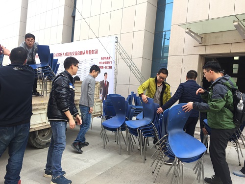 毕业生各党支部党员迅速集合,历经三个小时将会场内的450张桌子与700把凳子全部整理并归还于教学楼各个教室与大学生活动中心。