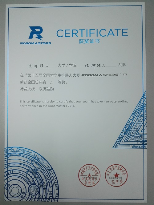 第十五届全国大学生机器人大赛RoboMasters2016总决赛——“机械再进化,英雄的崛起2016825--28日在深圳湾体育中心春茧体育馆成功举办。我校红柳猎人战队由糖果派对 李策教授、朱翔等老师带队,跻身全国十六强,获国家二等奖,同时获得了全国优秀技术报告奖。