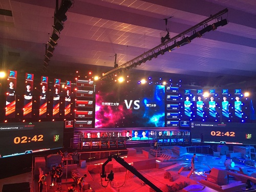 本次总决赛采用了太空废墟主题赛场,场地模仿月球表面坑洼不平,并伴有陨石掩体,高台中央设置了减血区,在上位U型区设置随机发弹区,较多攻击区域为陡坡,增加了比赛难度,也为比赛增添了科幻的氛围。