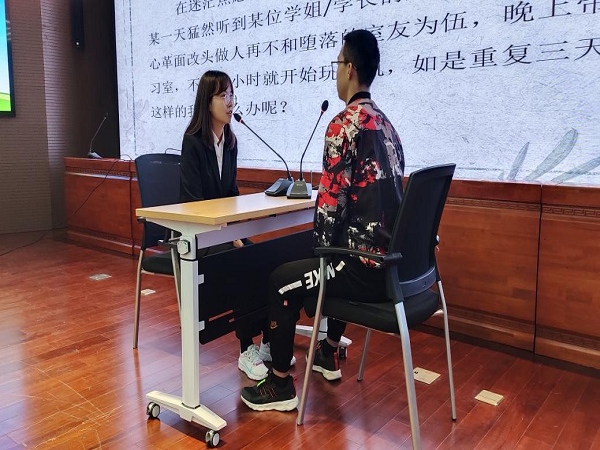 此次大赛分案例分析和现场模拟咨询两个环节。面对案例主要围绕大学生学习、生活、情感问题,参赛选手结合自身遇到的实际问题表达自己的看法,有的心理委员结合自己日常学习了解阐发自己的所思所想。第二环节模拟心理咨询环节。助演嘉宾扮演需要进行心理谈话的同学,心理委员则需要通过与其交流来引导学生能够正确认识和面对问题。参赛的心理委员们用倾听、温暖、共情的方式与助演同学建立良好关系,提供支持并运用心理知识开展心理引导,陪伴同学们一起度过心理难关。