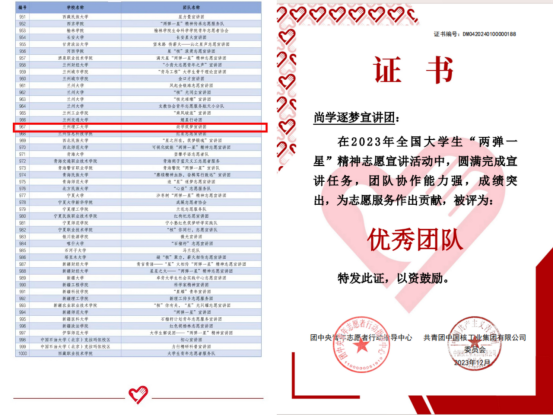 “尚学筑梦”理论宣讲团已连续两年入选全国大学生“两弹一星”精神志愿宣讲团队,并获评2023年全国大学生“两弹一星”精神志愿宣讲活动优秀团队。