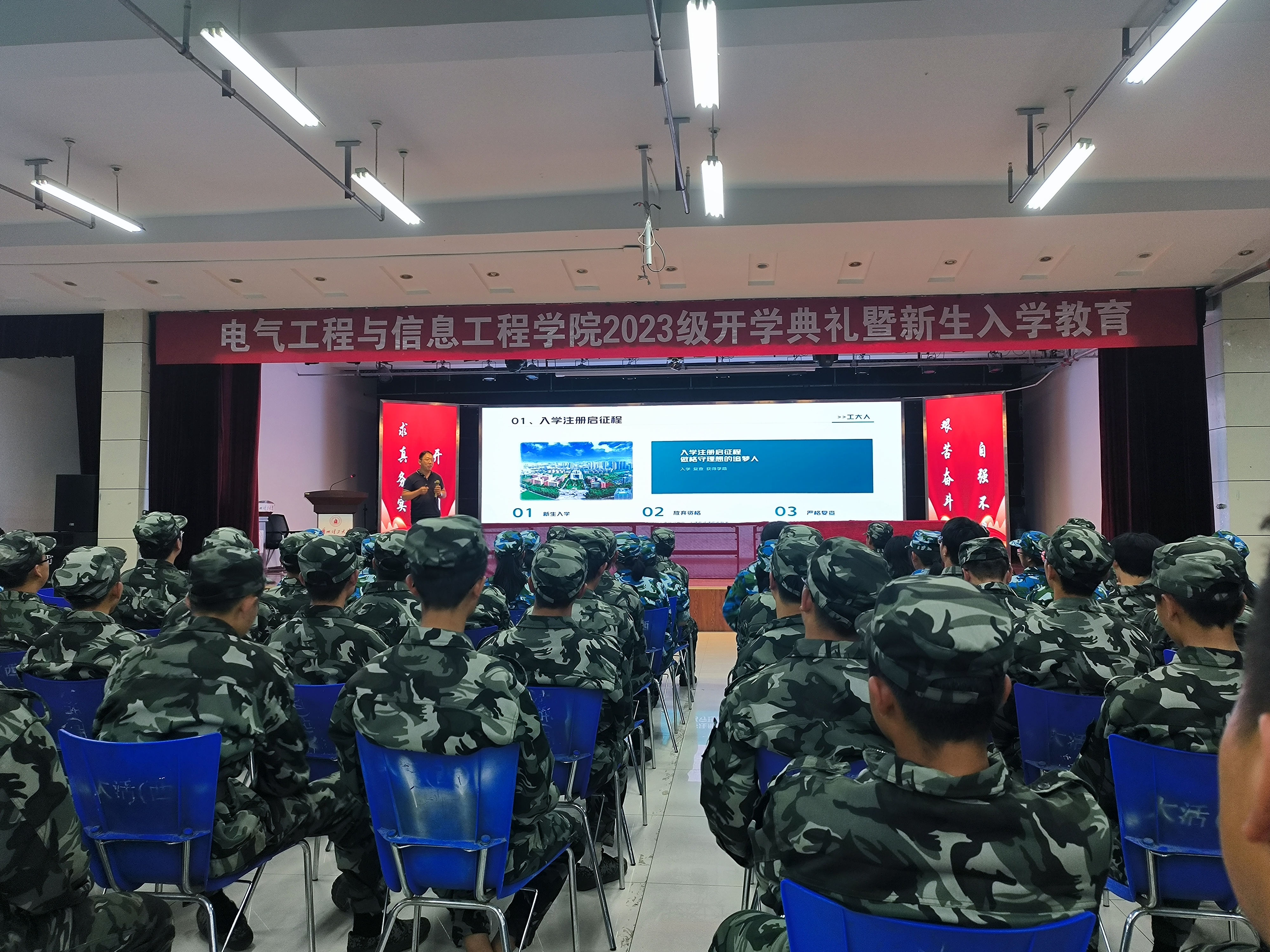 在第二阶段入学教育中,冯宜伟副院长就学籍管理、考试挂科、诚信教育、学分制度等几个方面为2023级新生做了具体介绍。刘炜副书记就宿舍管理、违纪处理、消防安全、网络安全、防范电信诈骗等方面向新生做学生管理专题教育,希望同学们在大一伊始,就做好学习规划,不仅能够学会如何学习,更要学会如何为人处事,珍惜时光,不负韶华,在大学四年茁壮成长。