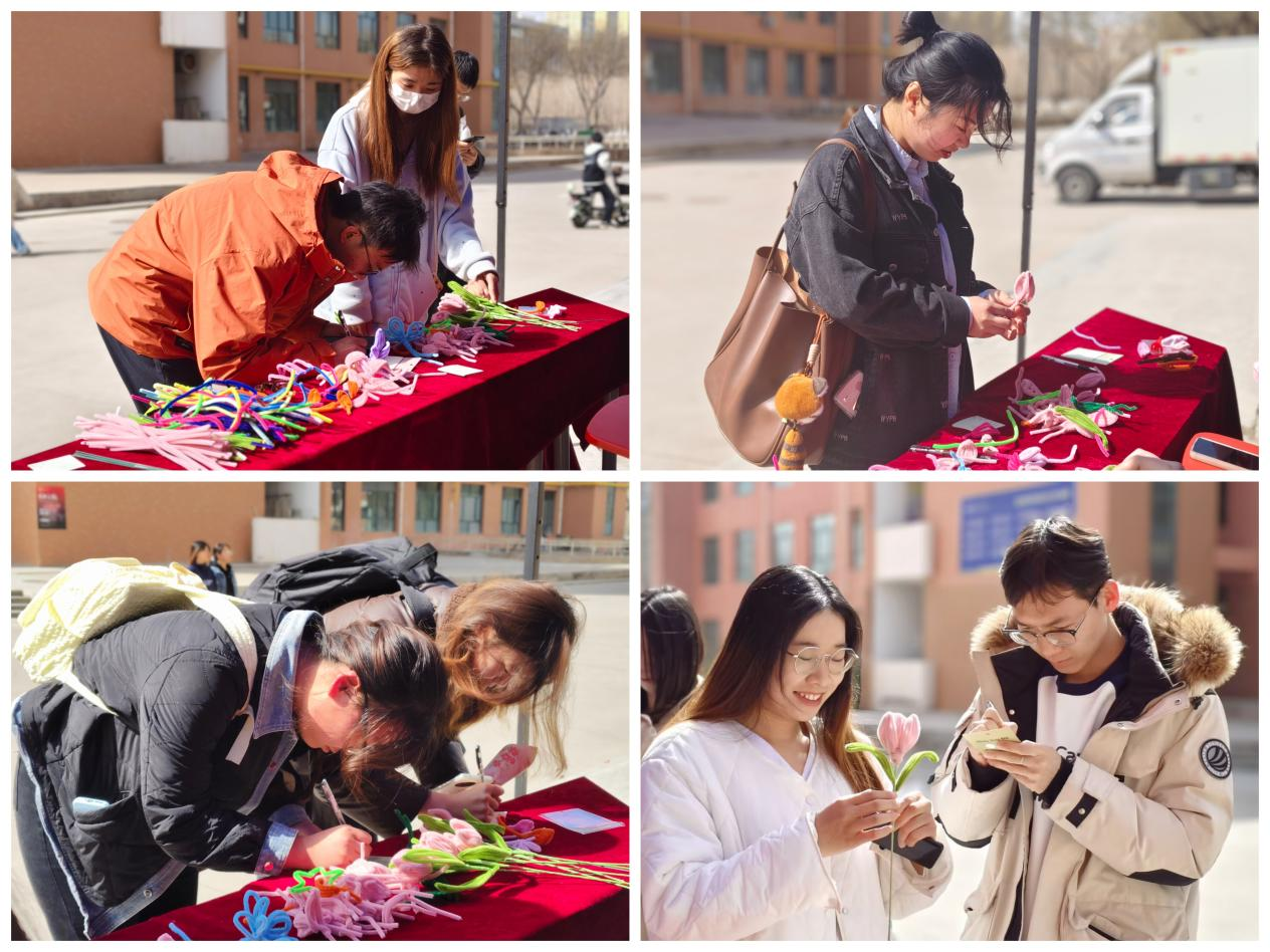 面向全体女性学生骨干,在一站式学生社区举办“芳华绽放”关爱活动。活动现场设置“双视角创作”环节,男生组构思创意造型、女生组精雕花瓣细节,协作完成花艺作品,培养团队精神。志愿者们将20朵立体郁金香制成“心愿盲盒”祝福卡,点缀于教学楼、糖果派对