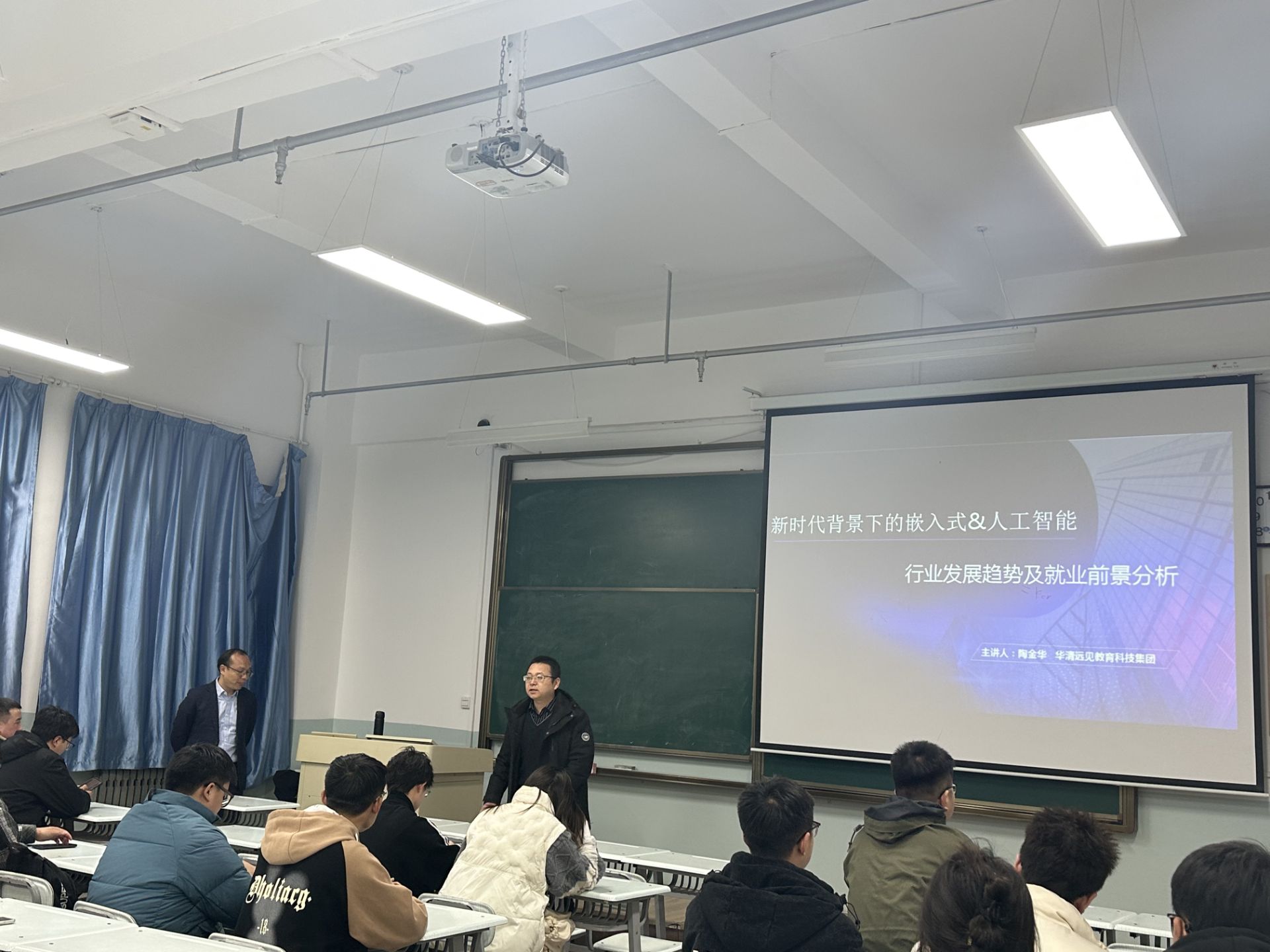邀请华清远见教育科技集团的陶金华副总裁作了精彩的专题讲座——“新时代背景下的嵌入式&人工智能行业发展趋势及就业前景分析”。陶老师从行业发展趋势、前景、就业方向和岗位等多个角度进行了深入浅出的讲解。他详细分析了嵌入式和人工智能行业的现状和未来发展趋势,以及这些行业中的就业机会和成功案例。他还特别强调了春招的重要性,并就如何准备春招、如何提高春招成功率等问题给出了宝贵的建议。
