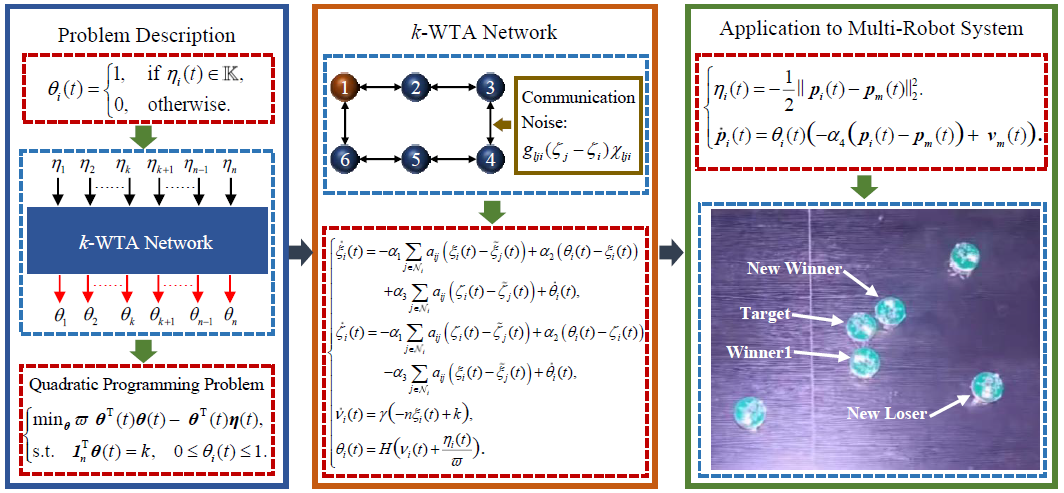 “A Distributed Communication-Noise-Resistant kWTA Network With Its Applications”,针对多机器人、无人机集群等系统在复杂噪声环境下难以可靠协同决策的问题,创新提出一种分布式抗通信噪声智能决策网络。团队进一步运用随机稳定性理论,严格证明了该网络在噪声环境下的收敛性与可靠性,并通过仿真与E-puck2多机器人实物平台实验,验证了方法的有效性与优越性。